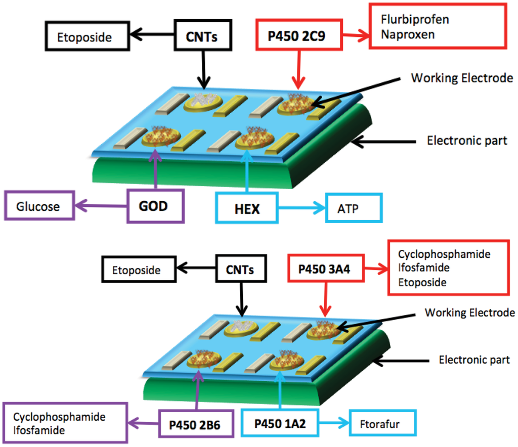 Fully integrated biochip platforms can build on existing technologies. Continuous monitoring is already in the market with commercially available devices for glucose [3] and lactate [4] while experimental prototypes have been already proposed for other endogenous metabolites, like glutamate [5] and ATP [6], as well as for exogenous metabolites (typically therapeutic compounds), like cyclophosphamide and naproxen [7]. The technology for continuous monitoring of glucose is robust enough to provide sensors with life-time up to 8 months when implanted in mice [8] and one year in pigs [9]. Sensor performance has been improved to meet sensitivity on physiological concentrations in human blood by using carbon nanotubes in case of both endogenous [10] and exogenous [7] metabolites.