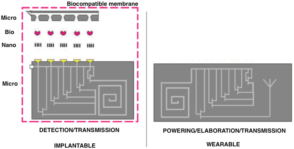 Recent advances in microelectronics and biosensors are enabling developments of innovative biochips for advanced healthcare by providing fully integrated platforms for continuous monitoring of a large set of human disease biomarkers. Continuous monitoring of several human metabolites can be addressed by using fully integrated and minimally invasive devices located in the sub-cutis, typically in the peritoneal region. This extends the techniques of continuous monitoring of glucose currently being pursued with diabetic patients. However, several issues have to be considered in order to succeed in developing fully integrated and minimally invasive implantable devices. These innovative devices require a high-degree of integration, minimal invasive surgery, long-term biocompatibility, security and privacy in data transmission, high reliability, high reproducibility, high specificity, low detection limit and high sensitivity. Recent advances in the field have already proposed possible solutions for several of these issues. The aim of the present paper is to present a broad spectrum of recent results and to propose future directions of development in order to obtain fully implantable systems for the continuous monitoring of the human metabolism in advanced healthcare applications.1. Introduction