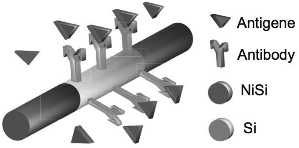 The material properties can be more precisely controlled by manipulating the conditions during nanowire synthesis, using well-developed doping techniques, and by suitable functionalization treatments [74] (e.g., antibodies in Figure 3).