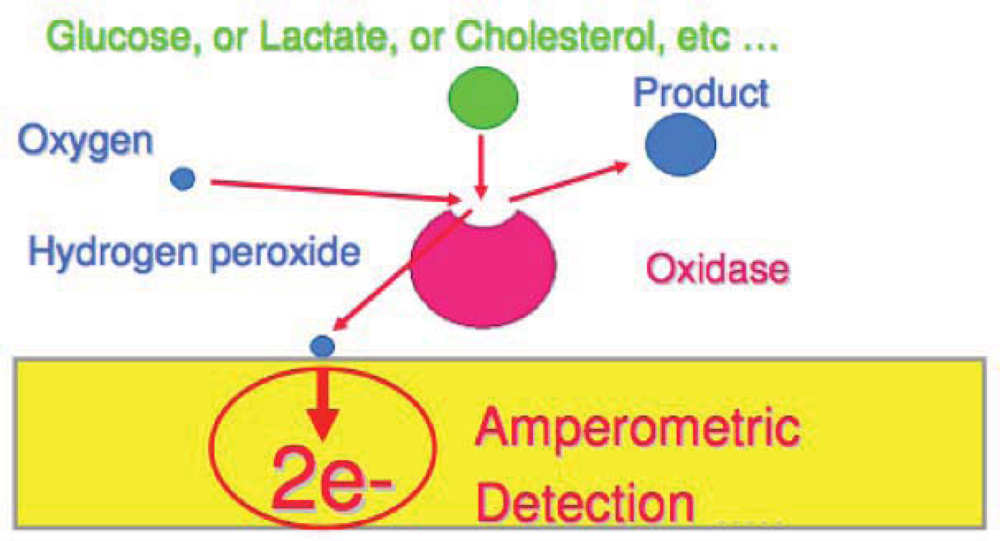 In general, many oxidoreductases including glucose oxidase, catalyse the oxidation of substrates by electron transfer to oxygen to form hydrogen peroxide [14] (Figure 4). These oxidoreductase enzymes can be immobilized on conducting polymer surfaces and the H2O2 formed in the reaction is measured amperometrically [57]. The most commonly used enzymes in biosensing are glucose oxidase (GOx) [102] and horseradish peroxidase (HRP) [16]. Other, less commonly used enzymes comprise beta-lactamase [103], and urease [104].