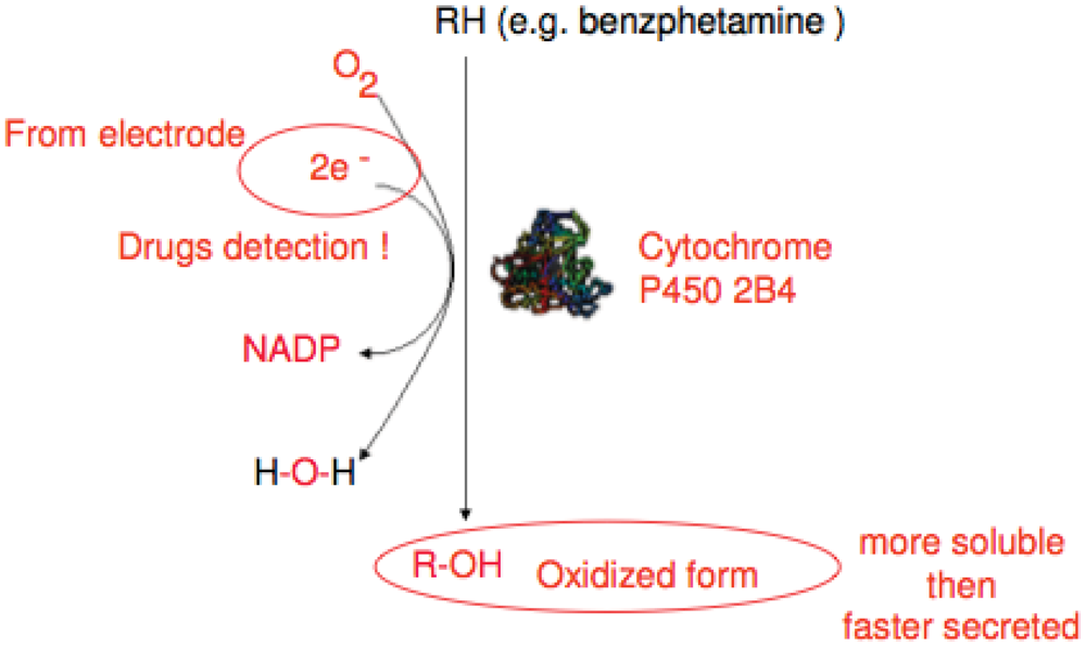 Another potential approach is the use of cytochrome P450 enzymes (CYP), as the biological recognition element in amperometric biosensors for drugs monitoring [106–109] (Figure 5). Recently Sharma et al. [110], extensively reviewed enzymes used in development of biosensors, also for industrial applications.