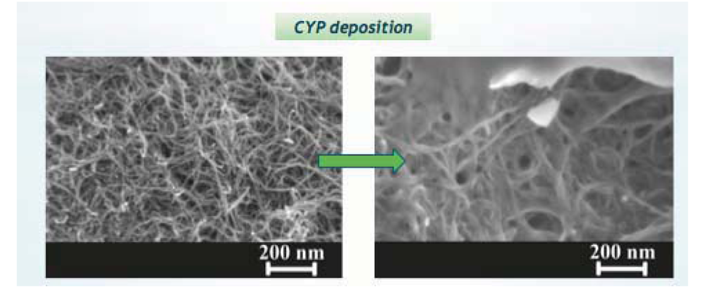 CVD incorporation of CNTs not only improves the electrical contact between the active sensing material and the conducting substrate, but also ensures that the sensor is free of any other materials used as surfactants and/or binders [174]. However, due to the CNT hydrophobicity, CVD-CNTs need to be chemically and/or electrochemically treated for the easy incorporation of the enzymes. Finally, CNTs grown by CVD may collapse in the presence of solvents.