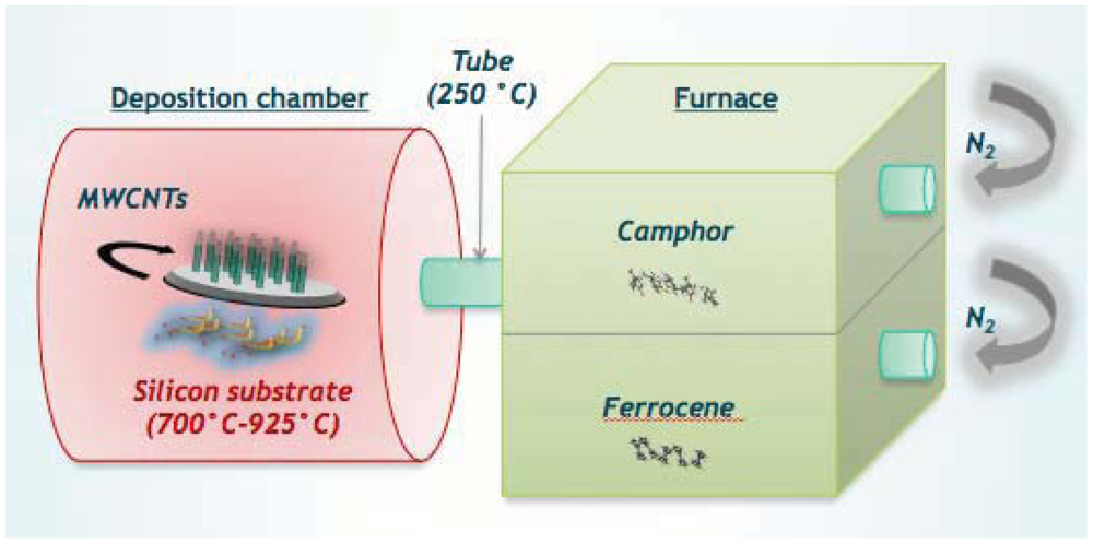 Direct growth by Chemical Vapour Deposition (CVD), is one of the most used forms of growing CNTs. In CVD, a hydrocarbon gas with carbon atoms is provided for the CNT growth on metallic catalysts [165]. The catalyst can be introduced in a vapour phase or is present as a solid layer on the substrate on which CNTs have to grow (Figure 8). Typically, nanotubes are grown on semiconducting or usually insulating silicon, silicon dioxide, quartz. The whole setup is then placed in a quartz tube, maintained at atmospheric pressure in a flow furnace. The hydrocarbon gas mixture is passed over the quartz at high temperatures (500–1,000 °C). The gas catalytically decomposes over the metal particles (iron or nickel) at these temperatures. Compared with other methods of CNT production, CVD has been regarded as the most promising for industrial application. In particular, CVD is the preferred choice to grow patterned CNTs on metal catalyst particles or islands deposited on top of the substrates. These catalytic metals are seeded onto metallic tracks realized on a substrate through standard microfabrication techniques (standard UV photolithography, electron-beam evaporation, lift-off).