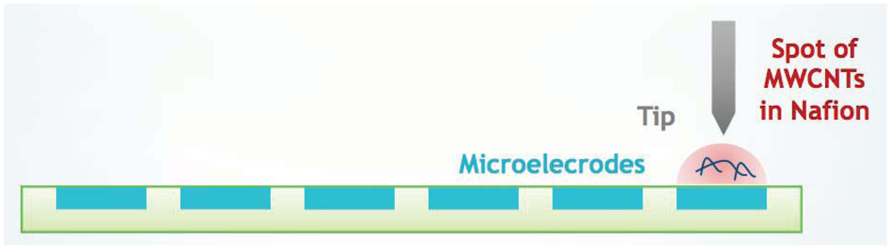 Micro-spotting casting immobilization is the most widely used method for fabricating CNT-based electrochemical sensors (Figure 9). With this approach, MWCNTs must be dispersed in a certain solvent with sonication after their purification and activation pre-treatments. The resultant suspension must be cast onto the electrodes and allowed to dry. In addition to different solvents such as chloroform [10], various additives are added into solvents to assist the CNT dispersion (e.g., Nafion, polymers) [174]. The predominance of these methods is their simplicity, which makes them suitable to fabricate CNT-based electrochemical sensors.