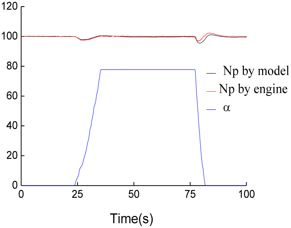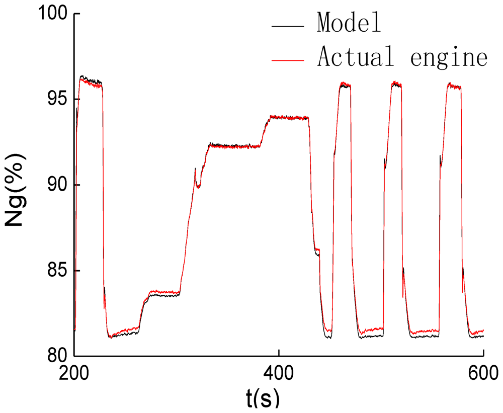 As seen from Figures 1 and 2, gas generator speed and power turbine speed calculated by model could track those of the actual engine. The relative steady errors of ng and np between engine model and actual engine are no more than 0.5%, respectively, while the dynamic errors are less than 2%.