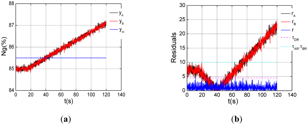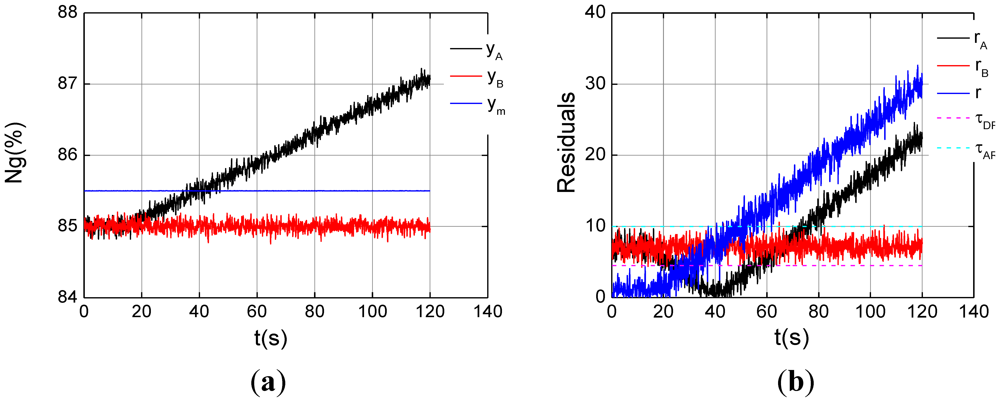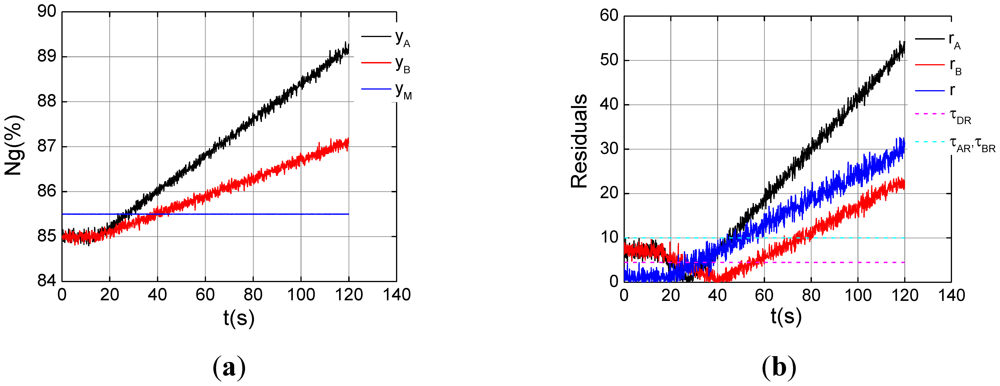 In Figure 9(a), the magnitude 0.02%/s drift fault is introduced into channel A from 15 s. The dual-channel residual r exceeds the τDR about at 30 s, and one of the analytic residual, rA, violates its threshold τAR at 75 s, as shown in Figure 9(b). Channel A fault is recognized about 2 s after 75 s.