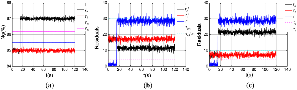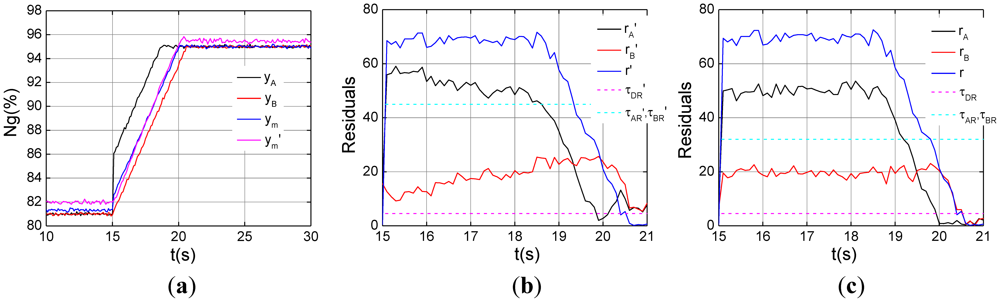 Sensor misdiagnosis will happen under the steady state of ng% = 81% by SPSO-SVR, which can be obtained the same process as Figure 8(b). The SPSO-SVR dual-channel residual r′ grows about 70, analytic residual rA′ about 50, bigger than their thresholds Δ τDR′ and τAR′ at 15 s. However the analytic residual rB′ does not violate its threshold τBR′, as shown in Figure 12(b). Therefore channel A fails according to the logic, and the diagnostic root cause is consistent with the sensor fault set. As can be seen from the Figure 12(c), the same determination can be obtained.