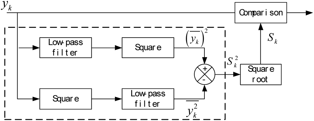 For this we use a statistical method to discriminate and eliminate outliers, the framework of which is as shown in Figure 4. Two low-pass filters are introduced in the program, and their outputs are the smooth estimates of the measurements. The dashed box in the figure produces the updated value of the sample variance, which can be used to obtain the threshold for determining outlier at the next time. The detailed procedure of outlier discrimination and elimination is given out as follows.