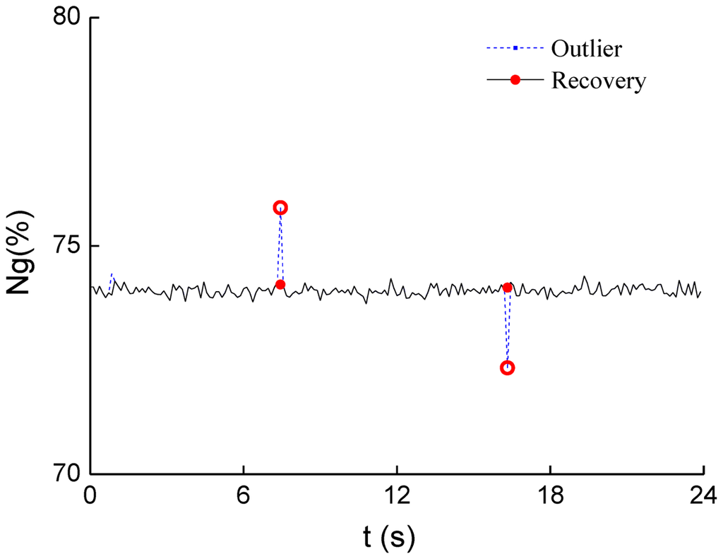 Gas turbine speed is directly influenced to the power of turbo-shaft engine, hence, the experiment to validate the proposed method is focused on the parameter ng. Figure 5 shows the simulation of outlier discrimination and elimination for the parameter ng.