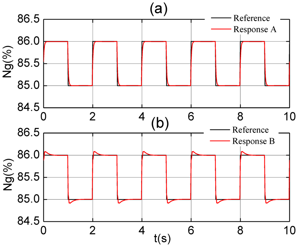The control system should maintain the parameter ng to the reference under the gas turbine mode, for which proportional plus integral (PI) controller is used. When proportional gain Kp = 200 and integral gain KI = 600, the step response for a 1% step input under the steady state of ng% = 85% is shown in Figure 6(a). In order to discriminate and eliminate outliers, the sensed data ng is held for two time steps to determine the variances in Equations (14–16). If we still select PI controller, the control system will become unsteady. Therefore, proportional-integral-derivative (PID) controller is designed, we set Kp = 80, KI = 400, and KD = 0.7. The overshoot of the 1% step response is less than 10%, the steady state is attained in 0.5 s, and the steady-state error is no more than 2%, as shown in Figure 6(b).