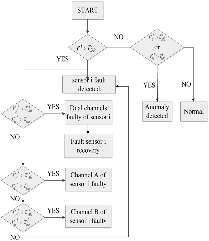 The sensor fault diagnosis logic can fulfill the following functions: (1) sensed data is detected; (2) sensor fault diagnosis; (3) faulty sensor recovery; or (4) anomaly detection. A flow chart of the sensor fault diagnosis logic is given in Figure 7.