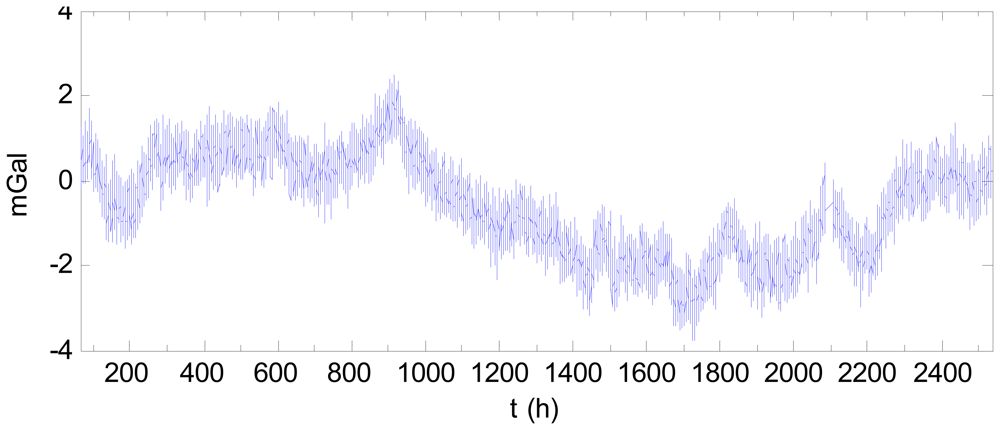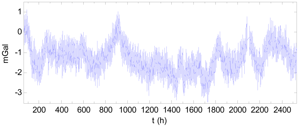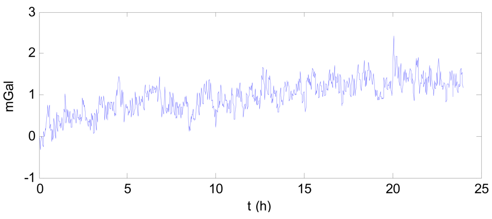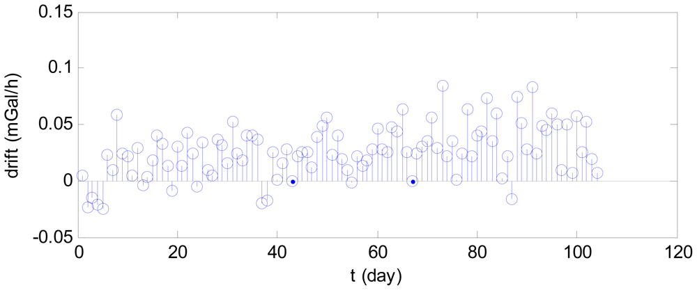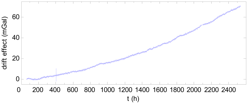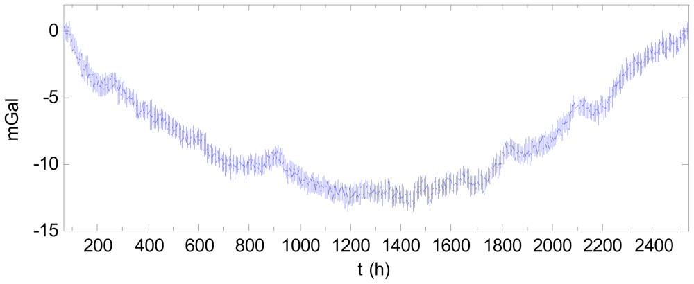 Figure 7 shows the 104-day data after filtering and subtracted by the starting value. A drift is clearly visible, with the drift effect of the final day being 70 mGal greater than that of the first day. This drift negatively impacts the accuracy of the gravity measurement. In Figure 7, there is an abnormality near 400 h, (i.e., 2 pm on 11 March 2011), which may be attributed to the major earthquake occurring at the time off the northeast coast of Japan.
