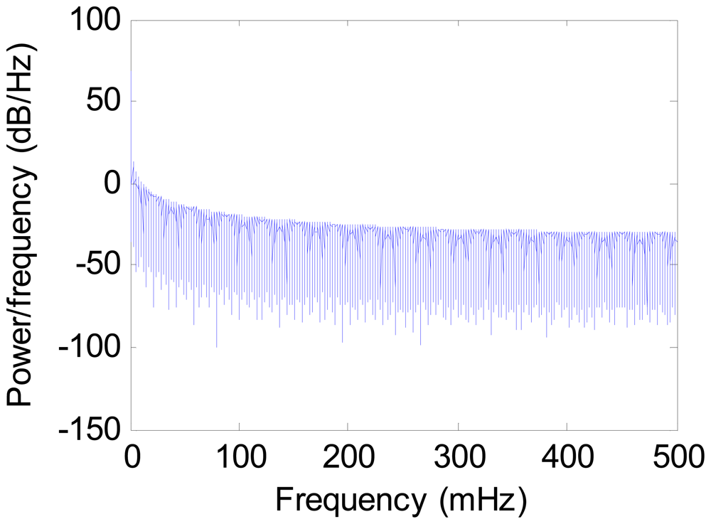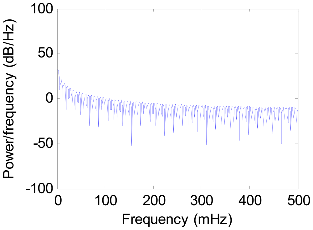 Figure 3. The power spectral density of the gravimeter data before filtering (27 May).The gravity is the low frequency information which occupies very narrow range of frequency near zero. As Figure 3 shows, there is high frequency noise in the observed data. After filtered by low-pass filter, the power spectral density of the data is shown in Figure 4.