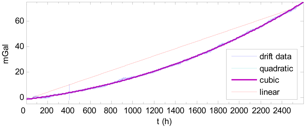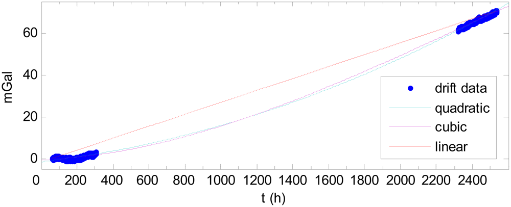 As Table 1 shows, the quadratic and cubic curves are superior to the linear curve. The linear curve can produce an error of as much as 13.61 mGal, whereas the quadratic and cubic curves fit the drift much better, with errors of less than 2.5 mGal. The quadratic curve and cubic curve fit the drift in the same accuracy; thus, cubic fitting is not necessary.