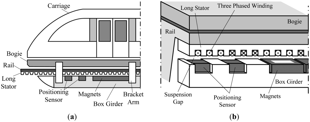 The suspension function of high speed maglev trains is carried out by the electromagnetic attractive force between the electromagnets and the rail, and the train is driven by a linear synchronous motor [1–3]. The 3-phased primary windings are inlaid in the slots of the long stator fixed along the rail, and the secondary windings are the electromagnets shown in Figure 1. In order to implement high efficient synchronous traction, the traction system needs the precise relative position between the electromagnets and the long stator.