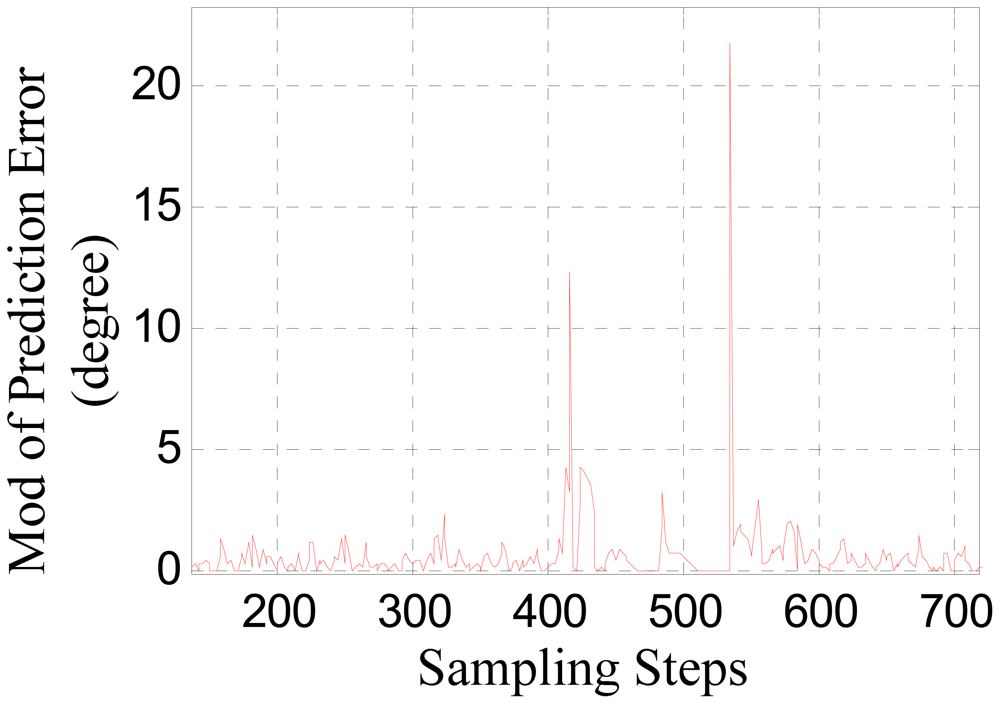 Figure 10 shows the prediction error. In contrast with Figure 6(b), after the noise suppression pretreatment, the characteristic distinctions between the signal distortions caused by large joint gaps and the measurement noise are amplified effectively. So the effectiveness and reliability of the sensor switching decision can be improved by comparing the signal shown in Figure 10 to a suitable threshold.