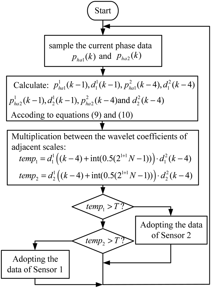 The sensors are connected with an upper computer via communication cables, and upload the phase signal via RS485 interface in real time. The upper computer identifies the signal characteristics due to the joint gaps based on the correlation between the wavelet coefficients of adjacent scales and then implement the sensor switching. The flow chart of the switching algorithm of the upper computer is shown in Figure 11.
