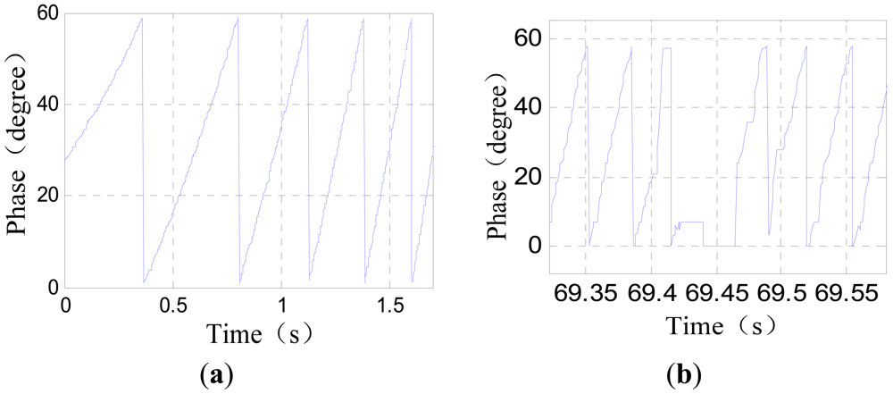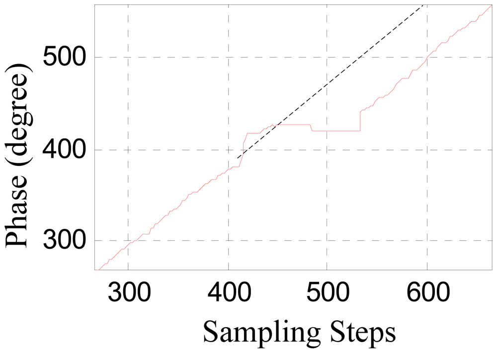 The converted phase signal near a large joint gap is shown in Figure 5, where the dashed line denotes the converted signal of an ideal phase signal. It can be seen that the tooth-slot period number counting loss results in a phase lag.