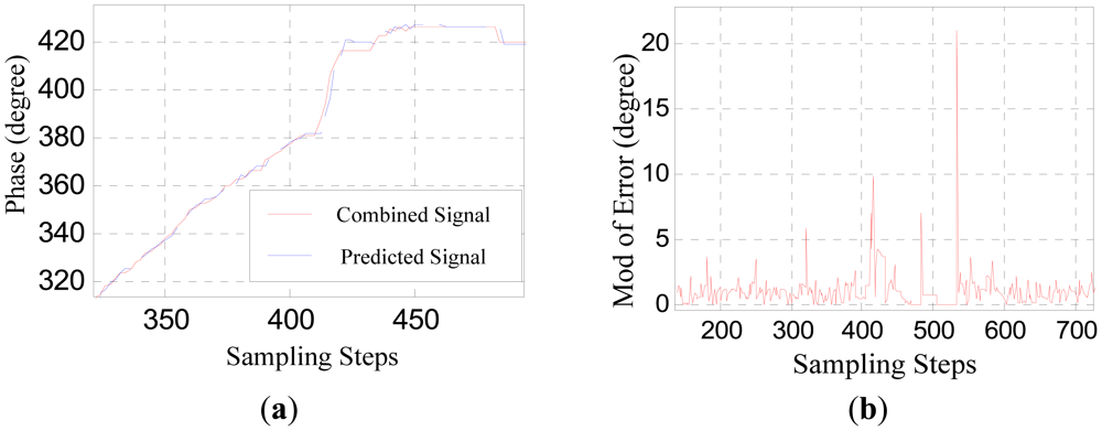Figure 6(a) shows the contrast between the converted phase signal and the predicted signal obtained through the adaptive linear prediction method discussed above. Figure 6(b) shows the absolute value of the prediction error.