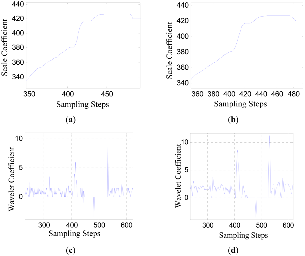 The analytical results of the converted signal pha(k) based on stationary wavelet transform algorithm are shown in Figure 7. The signal is transformed on two scales (j = 1,2). Figure 7(a,b) show the scale coefficients, and Figure 7(c,d) show the wavelet coefficients.