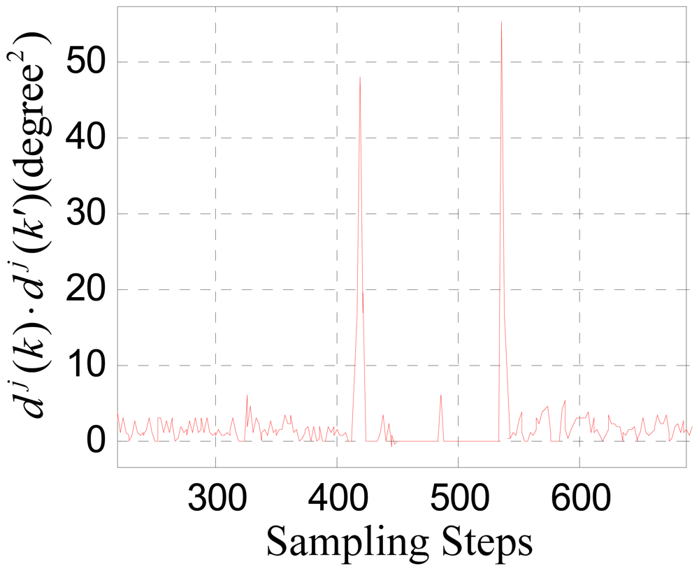Figure 8 shows the waveform of dj(k) · dj(k′), where c = 0.5. It can be seen that after the multiplication between the wavelet coefficients of adjacent scales, the wavelet coefficients indicating the moments when the sensor is moving into and out of the influence range of the large joint gap are enhanced obviously.