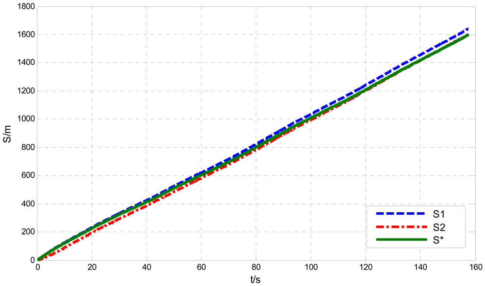 During the acquisition operation, the positioning accuracy is almost as same as it declared. However the speed-measuring accuracy of the GPS receiver at field is a little worse than labeled at about 0.05 m/s for both the bias and standard deviation. Substituting those parameters along with the mean speed calculated from the speed history shown in Figure 9 (10.43 m/s) into Equations (7), (12), (13), it can be concluded that the correction length should be no shorter than 1,252 m. Because of the acquisition road length is longer than the minimum correction length, we use it as correction length for the LEC. Figure 10 gives the whole-journey speed integral distance S1, positioning calculated distance S2 and the calibrated distance history S*. The result shows that, the calibrated history coincides with the speed integral history at first, and approaches the positioning calculated history gradually as the travel distance increases. Known from section 3 of the paper, the corrected history S* will keep a reasonable accuracy of both the total travel length and the adjacent data.