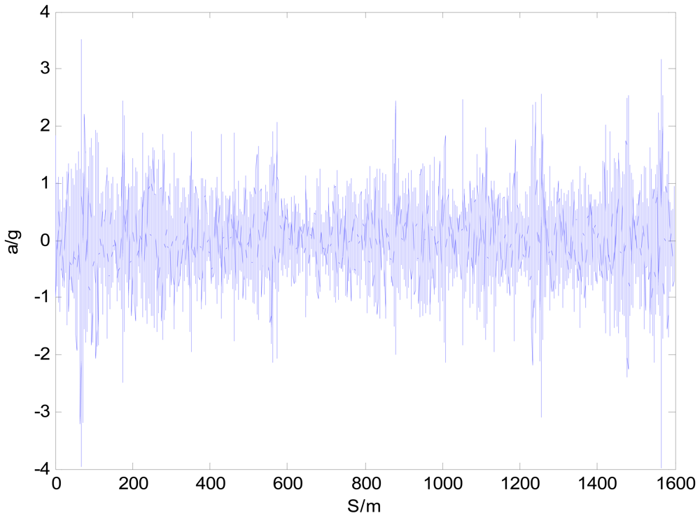 The equi-distance sampled acceleration history is shown in Figure 11. For comparison, when the simulation speed is set to the mean speed of acquisition, by the method raised in this paper and that directly obtained through Equation (3), the road's space acceleration spectrum Ga(n) and displacement spectrum Gd(n) are plotted in Figures 12 and 13 respectively. In Figure 13, eight standard road spectra according to ISO8068 have been plotted as references.