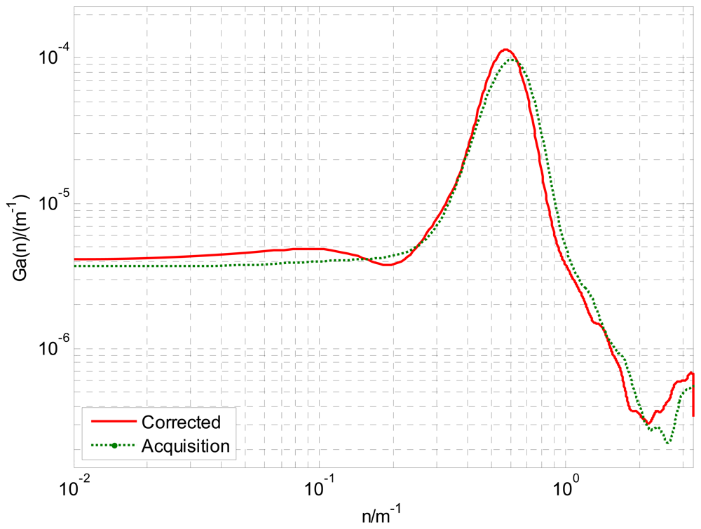 It can be concluded from Figure 2 that, the distance histories have a significant impact on the accuracy of the interpolated space history a(S) and its spectrum Ga(n). Actually, the noises contained in the histories of speed and geographic data measured by the GPS can produce large errors in the distance history Si(τ)|i=1,2 regardless of which equation, Equation (1) or Equation (2), is used.