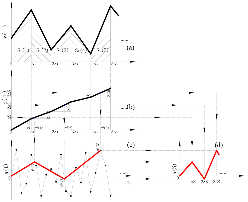 Plot the interpolated acceleration a*(τ*) on the space coordinates with the sampling interval of ΔS, forming the acceleration history a(S), as shown in Figure 2(b–d).