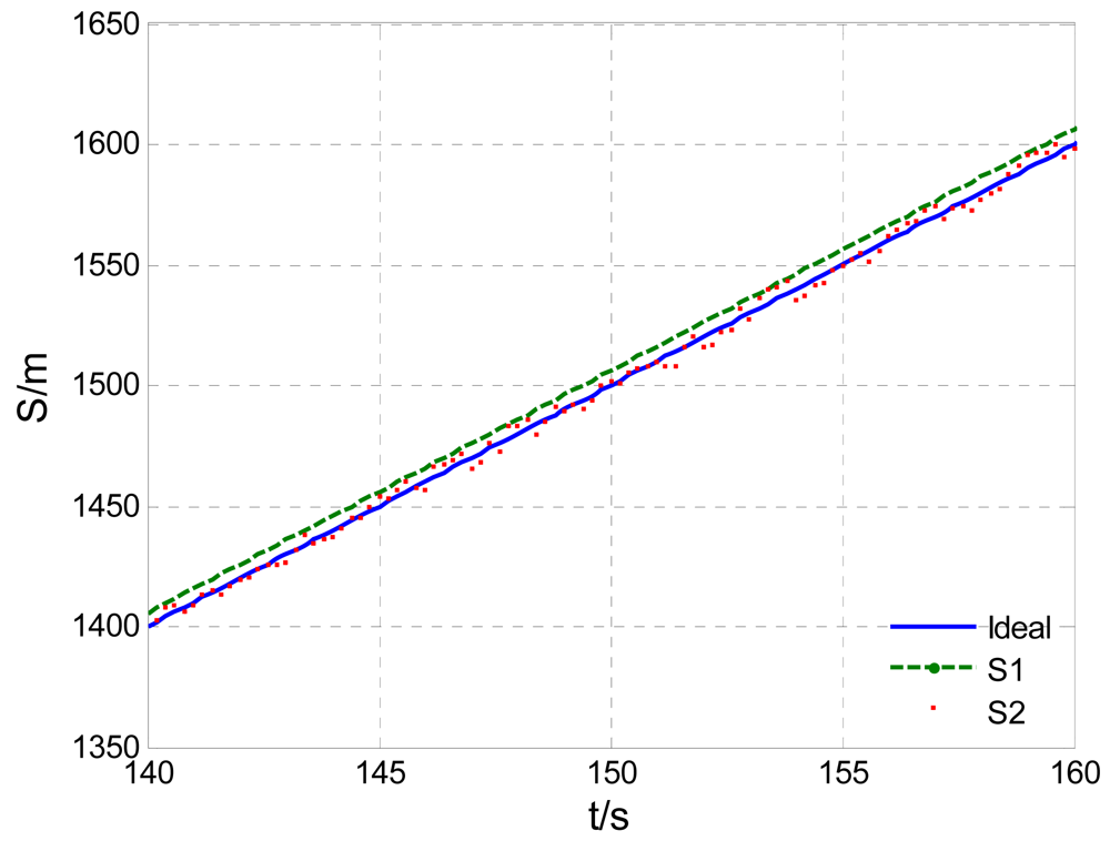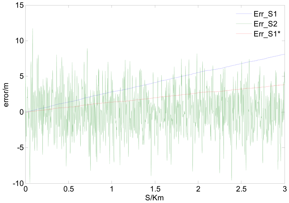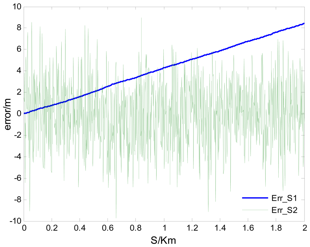 Supposing V=10 m/s, δ̄GPS-v = 0.04 m/s, σGPS-v = 0.03 m/s and CEPGPS-p = 3 m, the simulated velocity integral travel history S1 and positioning calculated distance history S2 in comparison with the theoretical distance history, are shown in Figure 3. Their distance errors vary with travel length as shown in Figure 4.