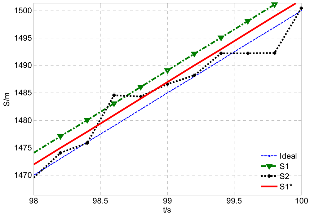 Illustrated by Figures 3 and 4, the characters of those two GPS calculated distance histories are as follows: the integral distance history S1 has higher accuracy (for the receiver used in the paper, the root mean square speed measurement error RMSGPS-v < 0.05 m/s) at the beginning of acquisition. However, due to the accumulated integration error impact, as the distance increases, the precision of S1 will reduce. On the contrary, the positioning calculated distance history S2 is of low absolutely accuracy during the whole trip (95% CEPGPS-p < 3 m, as in this paper). Its error level will not change with increasing distance. Namely, the relative positioning error to travel distance will decrease with the increasing travel distance. As shown in Figure 4, there exists a critical length SL. When the acquisition length is shorter than the SL, S1 will be more accurate. Conversely, if the acquisition length is longer than SL, S2 will be more applicable. The critical length SL can be deduced by Equations (5), (6) with the Equation below:
