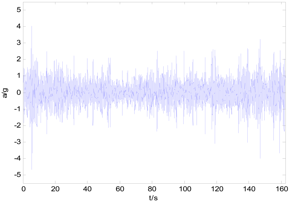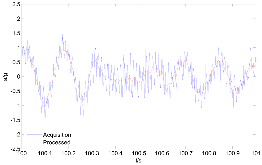 By using the acquisition system shown in Figure 1, all four wheels' acceleration responses (with frequency of 2 kHz) had been acquired during a wheel loader riding through a gradeless straight unpaved proving ground (PG) road. Considering that the low vibration frequency band (<30 Hz, as above mentioned) is useful for the durability tests, an anti-aliasing low-pass filter and resampling process with frequency of 100 Hz are implemented to the original collected signal. Figure 7 gives the time response history of the left front wheel. Figure 8 presents the comparison result of the processed wheel response with original acquired signal in one second.