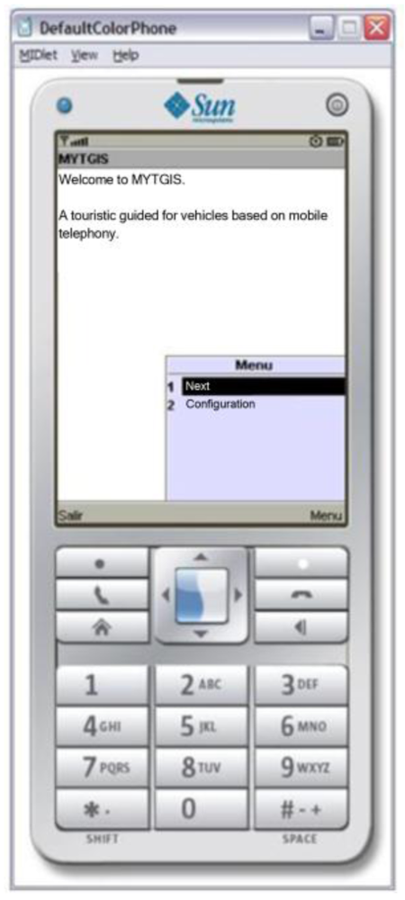In order to deal with the heterogeneity of users' mobile devices of, the Client Application has been developed in the form of a Midlet, so each mobile device is required to implement JavaME (Figure 2). This election has been made because, in our opinion, it is a way of guaranteeing that this application provided by the system can be executed in a large number of mid-range terminals and the adaptation enabling it to run on other types of terminals, such as Android terminals, is relatively easy. The heterogeneity of mobile devices in the market also affects the way in which data are stored and organized in the devices, making it impossible to take a common file system structure for granted; consequently, static data required by the application are embedded in the Java application itself. The first step to be performed in the Client Application is its configuration. In order to achieve the configuration, the user has to select the communication technology to be used—only in terminals with alternative communication technologies, such as Bluetooth and IEEE 802.11. When the user begins a guided trip, he must specify his preferences: define the bus route (trip) that he wants to take, his destination and how he wants to be informed. At the moment the system has two modes of reporting information: