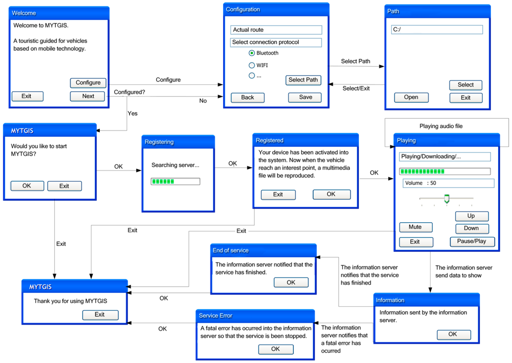 Initially, the user has to choose the communication infrastructure to be used: Bluetooth, WIFI, or others. Subsequently, the Client Application must automatically carry out the steps required to activate the necessary services that allow it to use the infrastructure chosen. It then starts the search among other devices that offer the service chosen. Once the on-board Information Server has been identified, the connection is established. In order to facilitate subsequent connections established by the server with the client, in this first connection, once the server has been selected, the client sends the necessary information so that the server knows that the device is using its application; this means that there is no need to repeat the search process for a device each time it sends a new communication to clients. When a device stops using the application, the server is informed and said device is eliminated from the list of devices connected. Once it has registered, the Client Application waits until the server sends it a file to be reproduced. During reproduction, the Client Application continues to wait for new communications. Finally, if the client terminates the application, this event is communicated to the server and it eliminates said device from the list of devices connected.