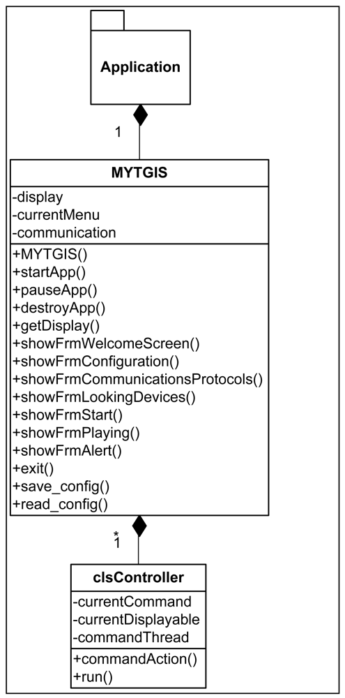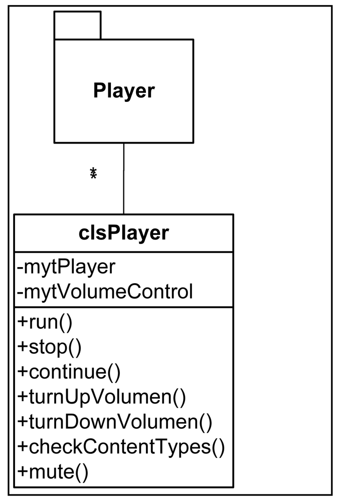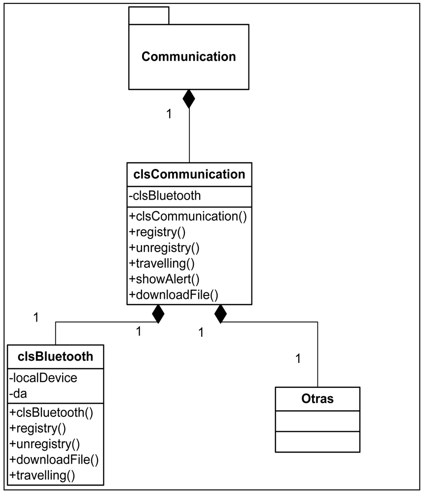 The communications system has been designed based on a clsCommunication type that manages the communications regardless of the protocol used (Bluetooth, WIFI, etc.). The class diagram of this subsystem can be seen in Figure 6. Finally, and to round off the Client Application design, Figure 7 shows the class diagram of the contents reproduction subsystem.