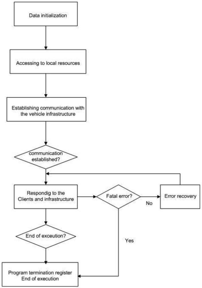 Error stage (S2). This stage is reached from S1 when an error has been detected. The error in question may be internal to the server application itself or external, such as a loss of connection with the on-board infrastructure. If the error can be corrected, stage S1 is returned to. Otherwise, S3 is reached, or stage S2 will be maintained until the error has been resolved, for example if communication with the infrastructure s lost, it will wait until communication is re-established.