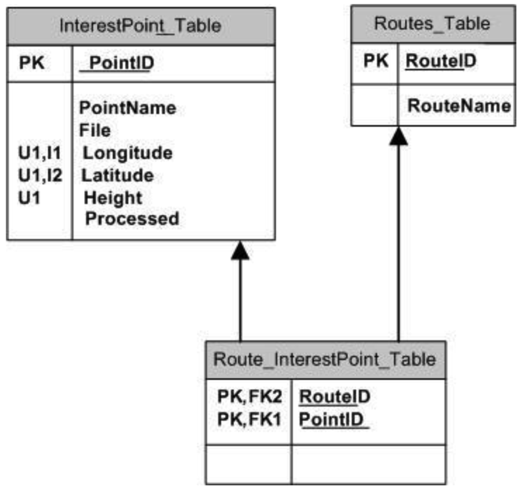From the point of view of the data, content management is supported by a data base comprising three tables: a table of routes (Routes_Table), one including points of interest (InterestPoint_Table) and the third that links routes and points of interest (Routes_InterestPoint_Table). The on-board data base is represented in Figure 9; in this figure the diagram shows the relationship between the tables: