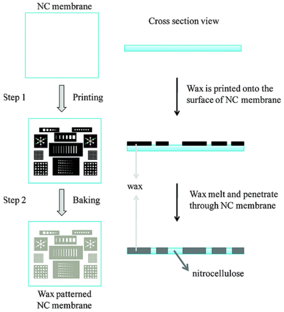 Lu et al. [38,44] assessed three different processes of patterning filter paper using wax and these are: (i) painting wax using a wax pen; (ii) employing an inkjet printer followed by wax painting, and (iii) using a wax printer directly to print the wax. Wax painting is relatively straightforward as it only requires drawing the pattern with a wax pen followed by melting. However, the method is not suitable for creating complicated patterns. When complicated pattern design is necessary, the pattern can be printed on paper first and then painted with wax. Alternatively, the need for a wax pen can be eliminated by direct wax printing. Ge et al. [50] also used this wax printing technique to pattern and fabricate 3-D origami-based devices which will be discussed later on.