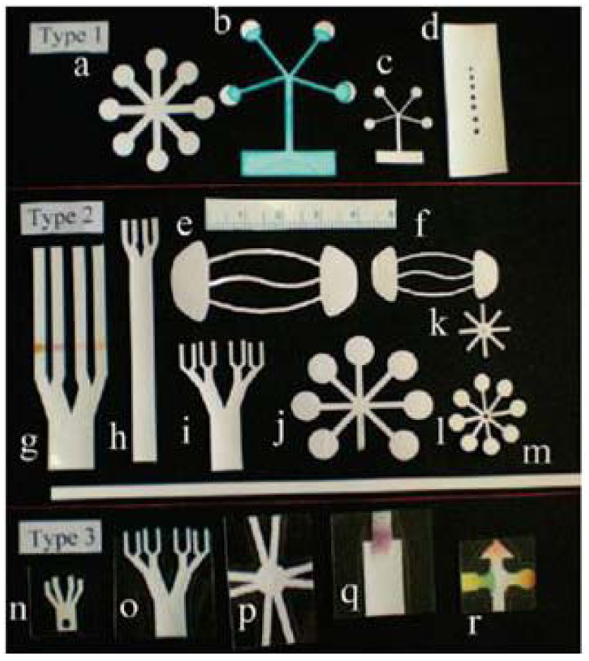 Not all paper sensing devices require the formation of a hydrophilic channel within a hydrophobic barrier. Wang et al. [12] demonstrated a tree-shaped paper for the semi-quantitative detection of protein. The filter paper was cut into a tree-shaped sheet with seven branches (3 mm × 45 mm) and a stem (8 mm × 55 mm). The design allows uniform microfluidic flow along the multiple branches when the stem is placed into a wicking solution and spotted with the sample at the branch. Wang et al. [12] have demonstrated that calibration standards and measurements of an unknown can be performed at the same time using this tree structure. In a more defined approach, Fenton et al. [13] used a computer controlled X-Y knife plotter to form star, candelabra and other structures with the paper. They sandwiched the paper between vinyl and polyester plastic films in order to prevent evaporation and protect the surface from contamination and dehydration during the assay procedure (Figure 3). Shaping the paper by cutting has proven to be an easier technique compared to photolithography where multiple steps are required.