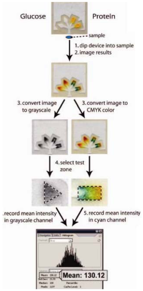 In order to improve the accuracy and sensitivity of the method, Martinez et al. [22] measured visible colour changes by using a camera phone or scanner (Figure 5). The image was captured and transferred to a computer and the colour was interpreted using imaging software where a pixel value is related to the concentration of the analyte. By using this system, data analysis could be easily interpreted.