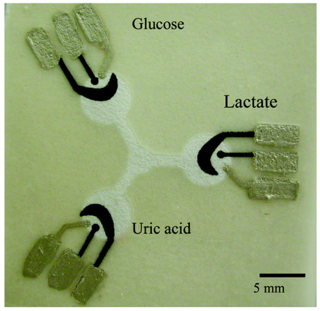 A wide range of inks can be used to produce electrodes on various substrates including paper. The common materials used for creating the electrodes are carbon inks for fabricating working and counter electrodes while silver/silver chloride ink is used for the reference electrode [24,26]. Dungchai et al. [24] combined electrochemical analysis for the detection of glucose, lactate and uric acid on paper-based electrodes for the first time. The conductive electrode pads were screen-printed in the hydrophilic region of the paper where enzymes were subsequently spotted. The electrode design is shown in Figure 6. The sample solution was deposited on the centre of the paper and it flowed to the reaction sites that contained the three-electrode system. The analysis was performed using chronoamperometry at the optimal potential for hydrogen peroxide production. The hydrogen peroxide arises from the oxidase enzymes which catalyses the oxidation of the enzyme substrate such as glucose, uric acid and lactate while reducing oxygen to hydrogen peroxide. Moreover, they also performed electrochemical analysis for the detection of gold and iron [30]. The electrochemical analysis was carried out using cyclic voltammetry and square wave voltammetry experiments.