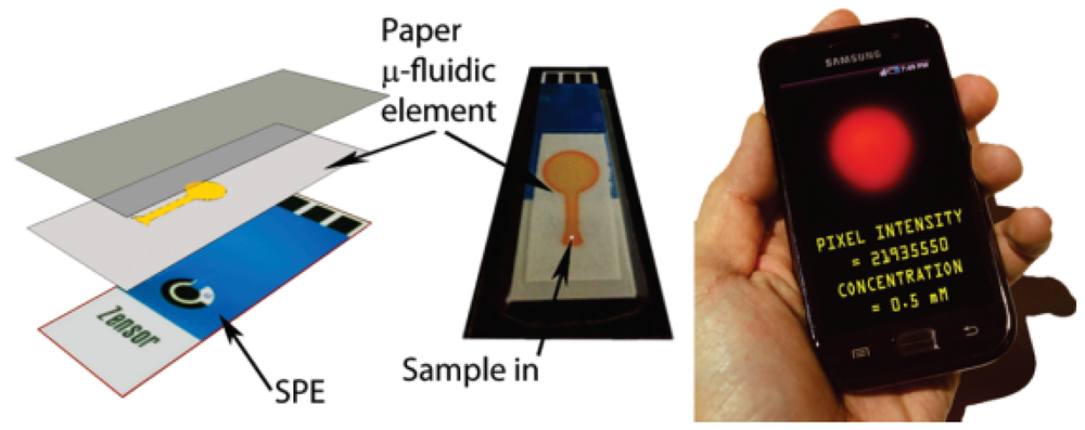 Chemiluminescence and electrochemiluminescence are analysis methods that have also been successfully performed on paper-based sensing devices. These techniques have gained attention due to their simplicity, low cost and high sensitivity. Yu et al. [7] demonstrated a microfluidic paper-based device for the detection of glucose and uric acid based on the chemiluminescence reaction between a rhodamine derivative and hydrogen peroxide. The paper device consisted of an injection hole for introducing the sample to the filter paper, two bioactive channels where the enzymes (glucose oxidase and urate oxidase) were immobilised and two chemiluminescent detection areas containing the rhodamine derivatives. All the components were integrated between two water impermeable single-sided adhesive tapes. Interaction of a sample containing glucose or uric acid with the oxidase enzymes, produced hydrogen peroxide, which in turn interacted with the rhodamine derivatives to produce chemiluminescence. The quantitative analysis is based on the peak intensity of the emitted light which is proportional to the concentration of the analyte.