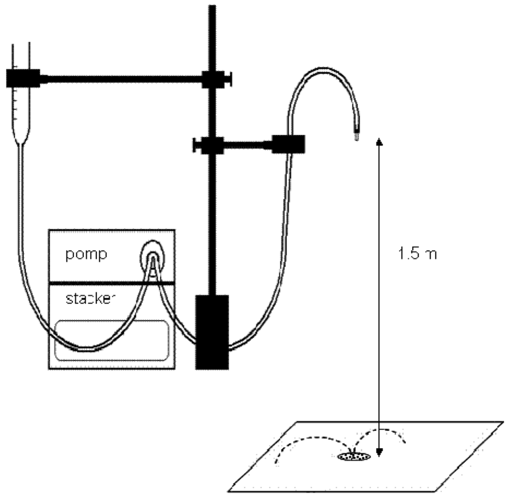The droplet-forming system (Figure 1) consisted of: (a) an Aqua-trend Series 100 Micro Peristaltic Pump with a flow rate of 0.96 mL/min, coupled with a device controlling single or continuous droplet dispensing; (b) a water container connected with the pump by water inlet hoses; (c) a hose transporting water from the pump to the pipette, from which water drops detached freely under gravitational force; and (d) a stand for precise ejection of droplets onto a defined site from a defined height. Droplets with a diameter of 4.18 mm falling freely from a height of 1.5 m were used for the measurements.