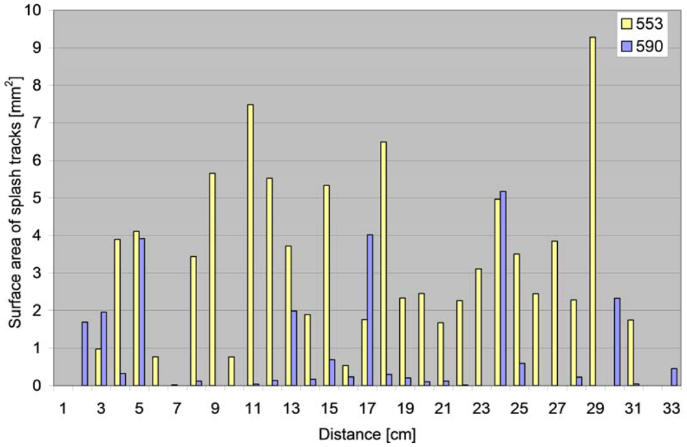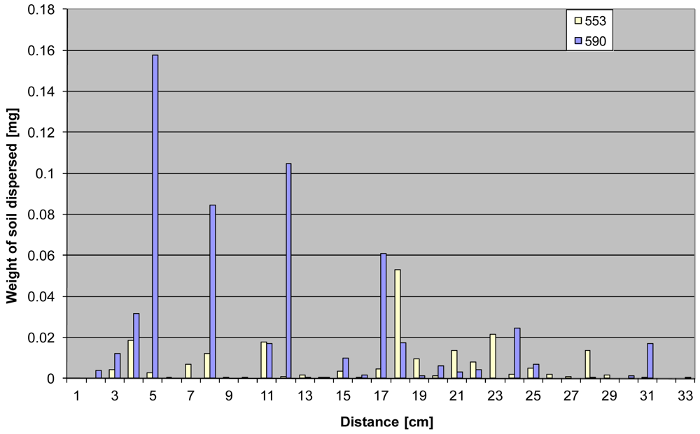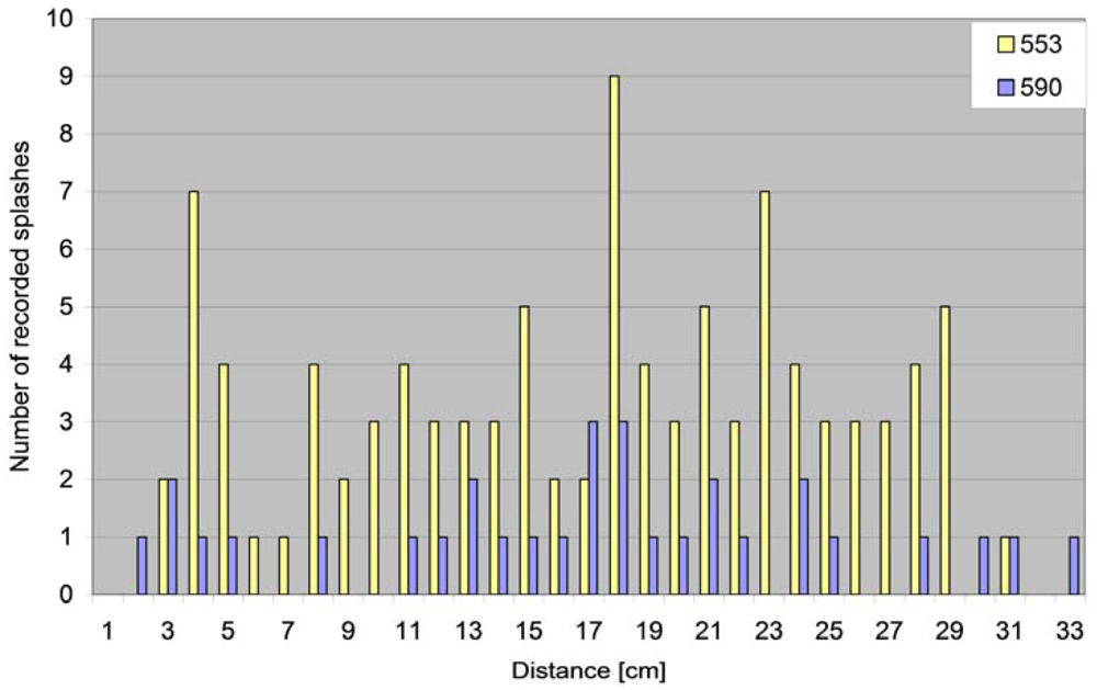 By ejecting 10 drops onto each of the 15 cylinders, 100 blotting paper sections were obtained for soil 553, and 31 sections for soil 590. Each blotting paper section represented one recorded splash. The distances at which the particles were dispersed from the site of water drop impact is presented in Figure 6. An example of the ability to easily and more accurately (compared with the commonly used compartments) record splash distances is shown in Figure 6. This could be the basis of further investigations, similar to those presented by Van Dijk and co-workers [29].