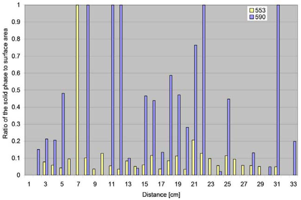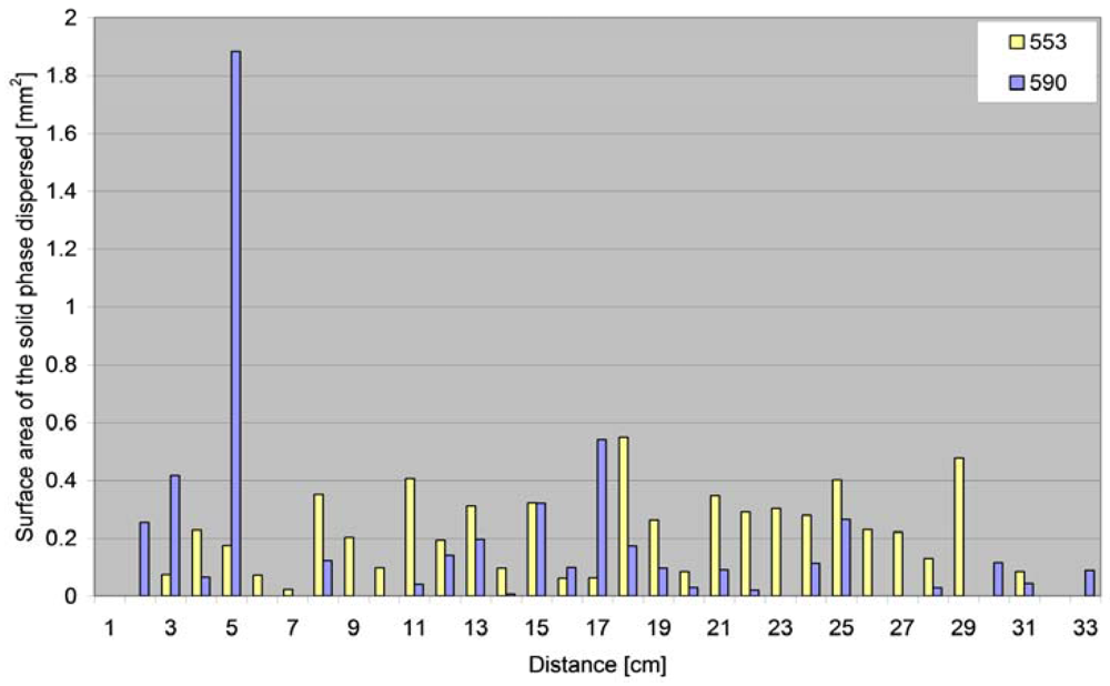 Another important parameter determined on the basis of image analysis was the surface area of the solid phase recorded in individual blotting paper sections in relation to the distance covered by the particles (Figure 11).