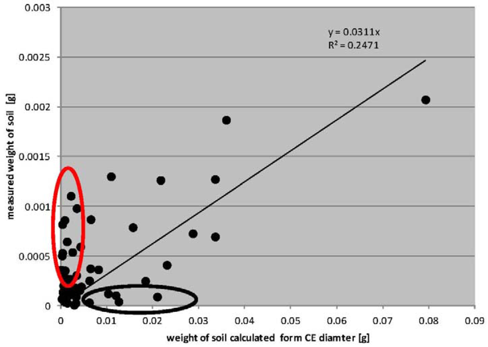 The black oval–the weight calculated from CE diameter is comparatively high. There were mainly those cases where the entire surface of a trace of dried droplets was practically completely covered by the soil (Figure 13) This situation was usually occurred when the splashed soil was very wet;