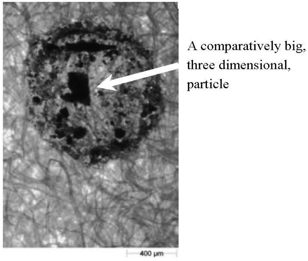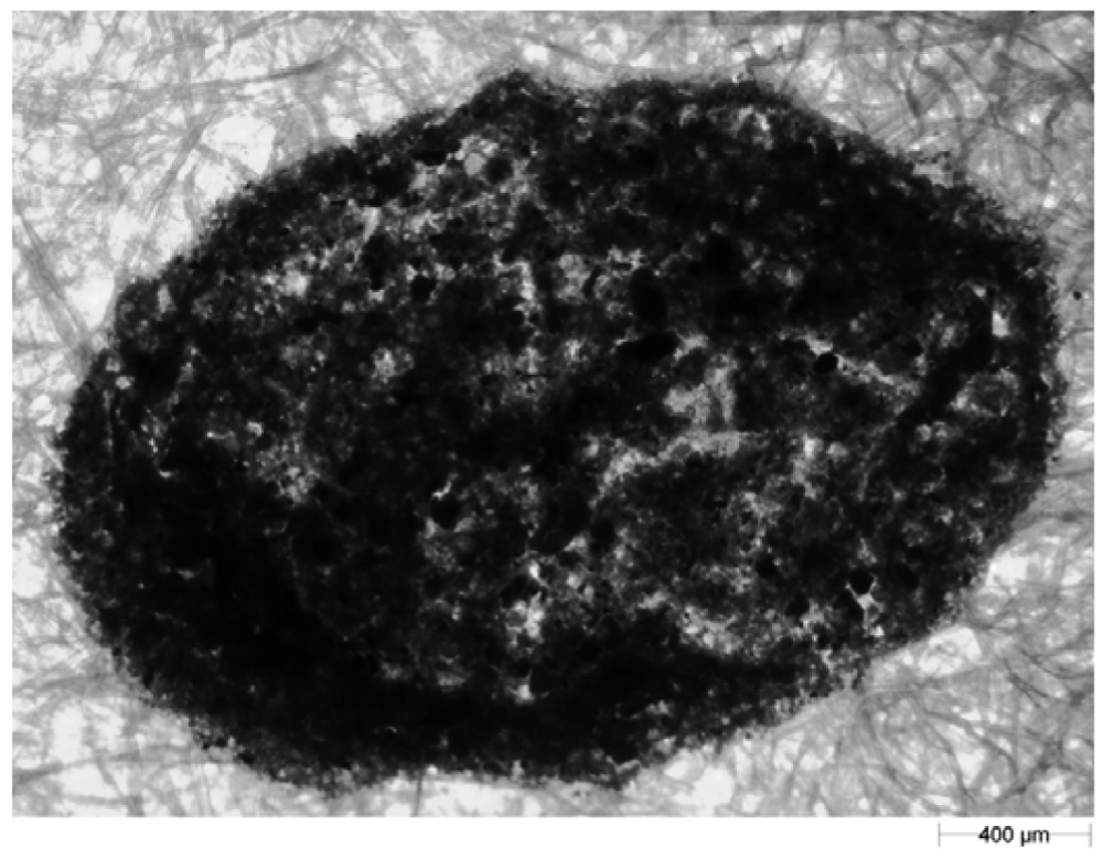 Since image processing prior to analysis (i.e., removal of the image of blotting paper fibres) of the shape and size parameters was time consuming and a potential source of error, an attempt was made to collect splashed soil particles on wrapping film or other kinds of papers (including coloured blue or green—colours that do not occur in soil). The film transparency or colour of the base allowed for easier identification of the splash image and suggested that the pre-processing procedure in the Matlab and GIMP programs may have been unnecessary. Unfortunately during the validation process of the wrapping film and coloured papers we could not find such material (papers or foils) sufficiently absorptive to avoid the slipping or secondary reflection from their surface—thus it was not possible to measure the distance of splashed particles. The second problem that appeared during initial attempts at using the wrapping film and other papers was the image of splashed particles. Due to the small wetting angle of the foil and to surface tension, the soil-water suspension remained drop-shaped after the splash. After evaporation of water, the soil particles were compacted so tightly that a three-dimensional lump was formed, which rendered the shape analysis pointless (Figure 5). Taking into account the abovementioned facts, analysis of particles using blotting paper was chosen. We decided to use the tedious and potentially faulty procedure described above (with Matlab and GIPM) while being aware of the possibility of using better paper in future. Use of material more suitable than blotting paper simplifies the procedure but will not change the basis of the proposed method.