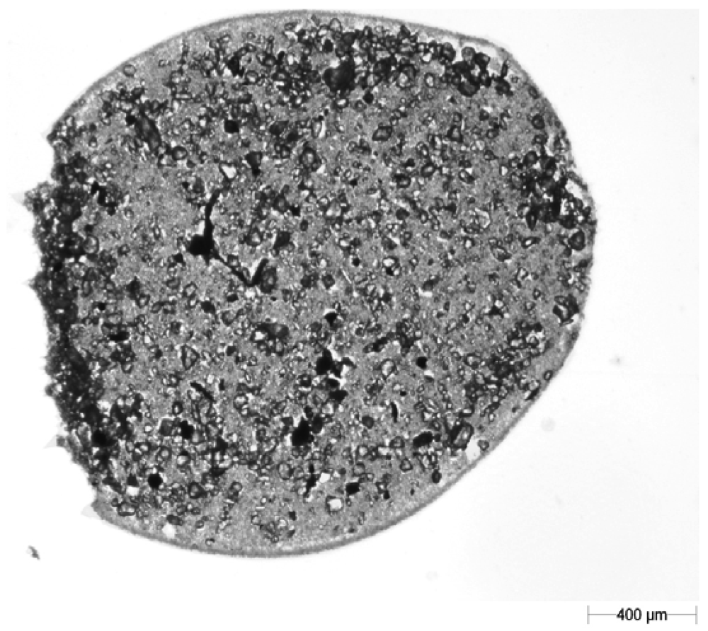 Figure 13. An example image of a particle with a comparatively large weight calculated from CE diameter.The red oval—the measured weight was comparatively high. There were mainly those cases where only the contour of the droplet was covered by soil particles; however, inside this contour was a large (three dimensional) sand or soil aggregate (Figure 14).