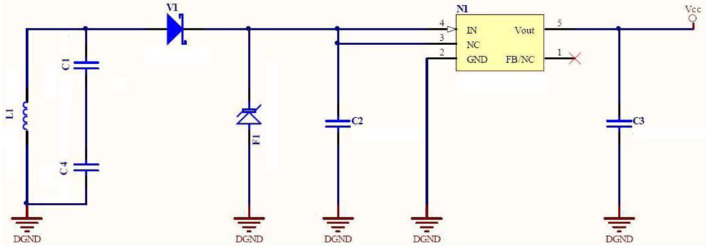 The first subsystem is a power subsystem composed of a tuned LC circuit, a Schottky diode rectifier and a low power, low dropout regulator (f.i., MC78LC30) that provides a constant DC voltage with two capacitors at its input and output. This approach avoids using a battery within the mouth. The values of the LC circuit are chosen so that it resonates near 125 kHz.