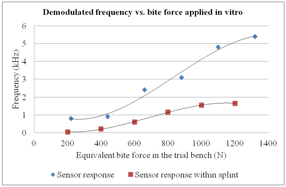 We also noted that, due to the additional protection of the transducer provided by the splint, the values of the demodulated frequencies measured in vivo are smaller than those obtained with the initial in vitro calibration using the trial bench. As instrumented splints can be manufactured using different polymeric materials, with different elasticity, the behavior of the system after manufacture should always be calibrated in vitro, using for instance a pneumatic workbench [22,27], in accordance with the desired personalized approach.